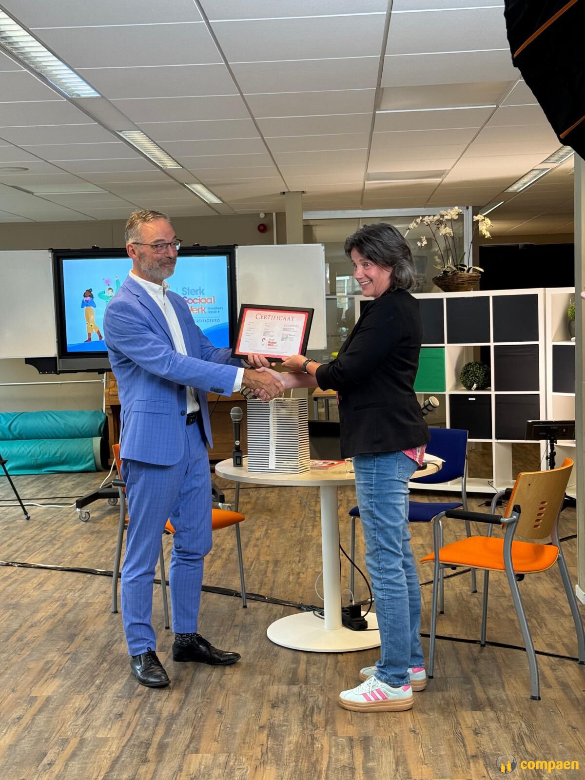 Met trots kunnen we delen dat Tintengroep en haar werkorganisaties het kwaliteitslabel Sterk Sociaal Werk hebben ontvangen! Dit label, uitgereikt door Sociaal Werk Nederland, geldt als een landelijke erkenning voor de professionaliteit, betrokkenheid en maatschappelijke waarde van sociaal werk. De officiële uitreiking vond plaats in Gieten. Lex Staal, directeur van Sociaal Werk Nederland, overhandigde het label aan de werkgroep Vakmanschap van Tintengroep, die een centrale rol vervulde in het proces naar deze erkenning. Volgens Lex Staal is het behalen van het label volledig verdiend: ‘Tintengroep laat zien hoe kwaliteit, vakbekwaamheid en lokale betrokkenheid hand in hand gaan. Daarmee onderstrepen jullie dat samen sterk staan echt werkt.’ Ook Saskia Bijlholt, onafhankelijk cliëntondersteuner en onderdeel van de werkgroep Vakmanschap, benadrukte de betekenis van het keurmerk: ‘Het Sterk Sociaal Werk-label is een blijk van waardering en erkenning voor het harde werk van al onze medewerkers. Het laat zien dat we kwaliteit en vakmanschap serieus nemen en biedt een mooie stap voor verdere doorontwikkeling.’ Met het label Sterk Sociaal Werk onderstreept Tintengroep dat wij voldoen aan de landelijke kwaliteitscriteria én dat we blijven investeren in de kracht van sociaal werk: deskundigheid, samenwerking en maatschappelijke impact.